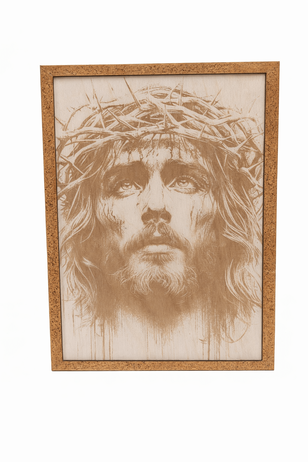 Ξύλινη εικόνα του Χριστού με το ακάνθινο στεφάνι, με έντονη καλλιτεχνική απόδοση και εκφραστικό βλέμμα. Οι χαραγμένες λεπτομέρειες δίνουν βάθος και δραματικότητα στο πρόσωπο. Οι φυσικοί τόνοι του ξύλου ενισχύουν τη λιτότητα και τη δύναμη της παράστασης. Η σύνθεση αποπνέει σεβασμό, πίστη και εσωτερική γαλήνη