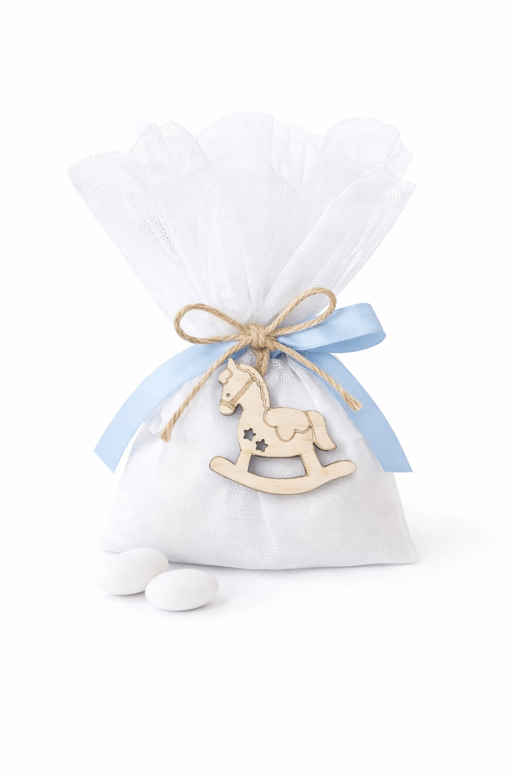 Λευκό τούλι δεμένο με φυσικό σπάγκο, διακοσμημένο με ξύλινο αλογάκι κουνιστό κομμένο με ακρίβεια CNC, δημιουργεί ένα γλυκό και διαχρονικό αποτέλεσμα.