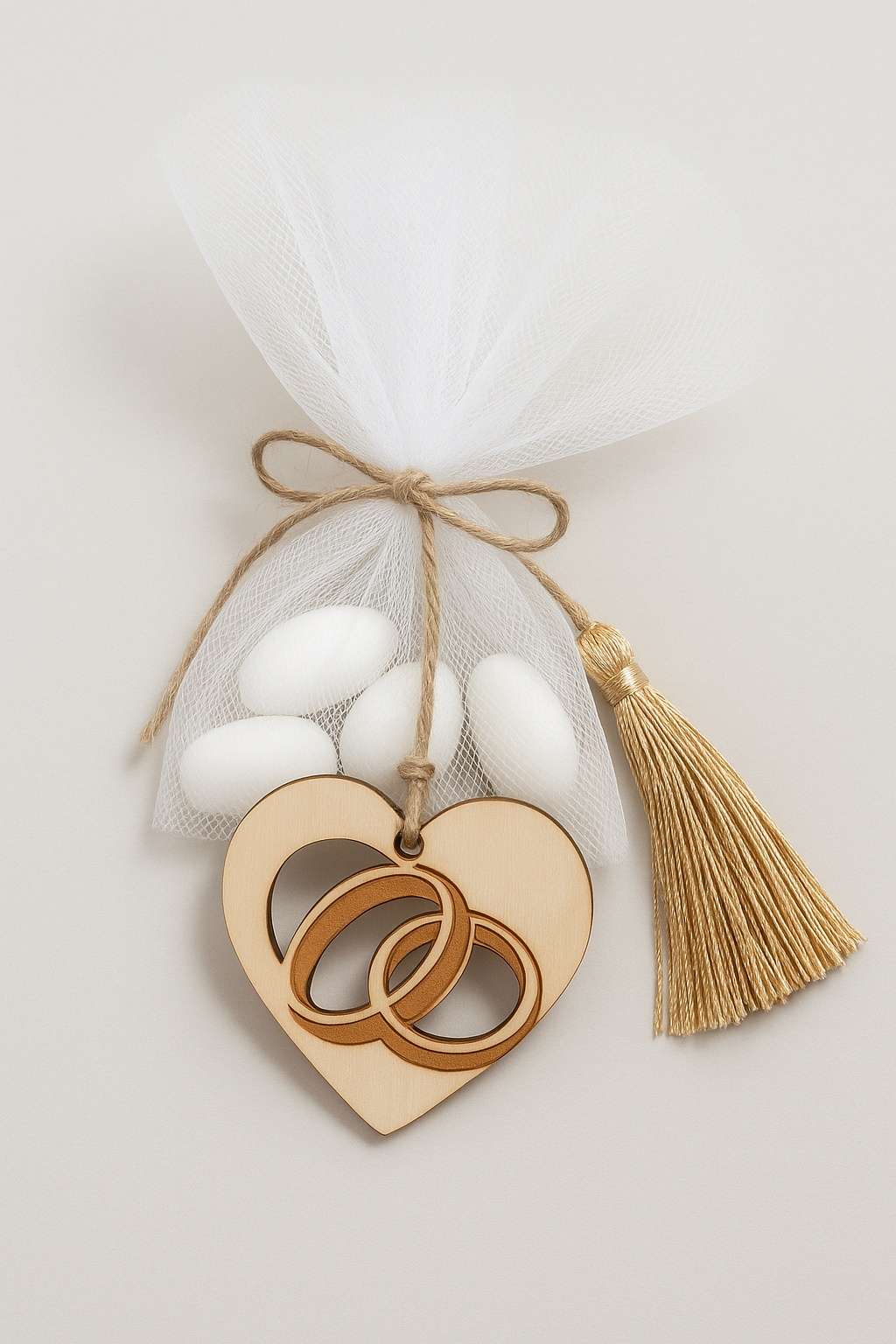Όμορφη και λιτή μπομπονιέρα γάμου με ξύλινο κρεμαστό σχέδιο βερών και διακριτική χρυσή φούντα. Το φυσικό ξύλο προσδίδει ζεστασιά και κομψότητα, ενώ το laser engraved σχέδιο δίνει μια καλαίσθητη, μοντέρνα πινελιά.