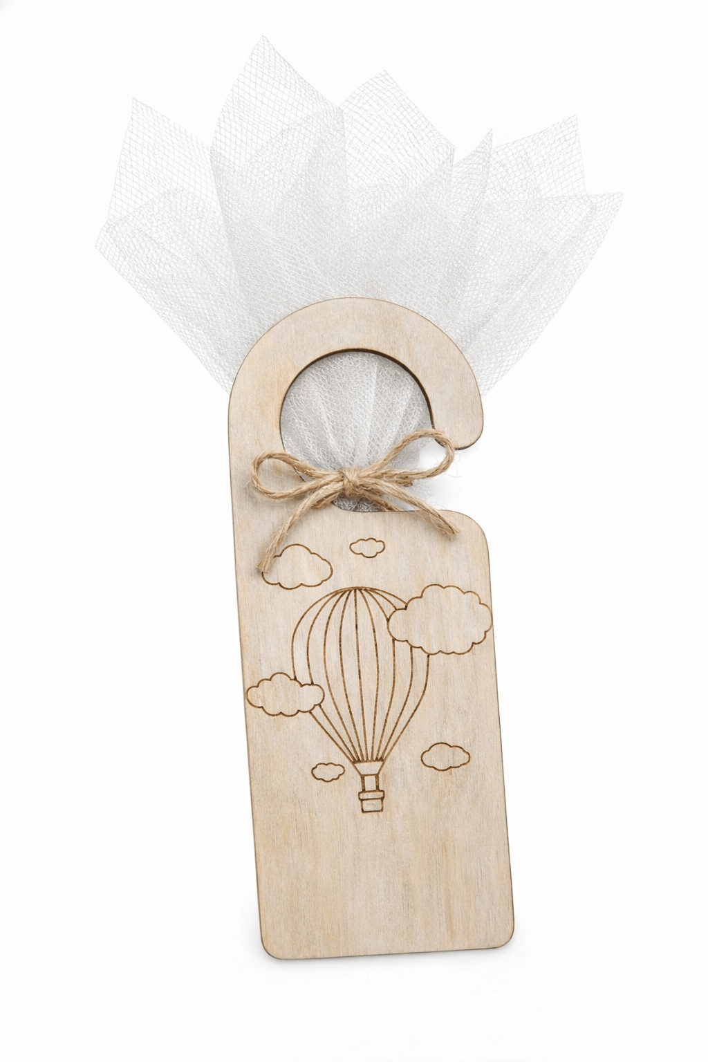 Κομψή μπομπονιέρα βάπτισης με ξύλινο διακοσμητικό αερόστατο, δεμένη σε λευκό τούλι και φυσικό σπάγκο. Το ξύλινο στοιχείο είναι κομμένο και χαραγμένο με λεπτομέρεια, προσδίδοντας έναν ρομαντικό και ταξιδιάρικο χαρακτήρα. Ιδανική επιλογή για βάπτιση ή παιδικό event με θέμα το ταξίδι ή τον ουρανό.