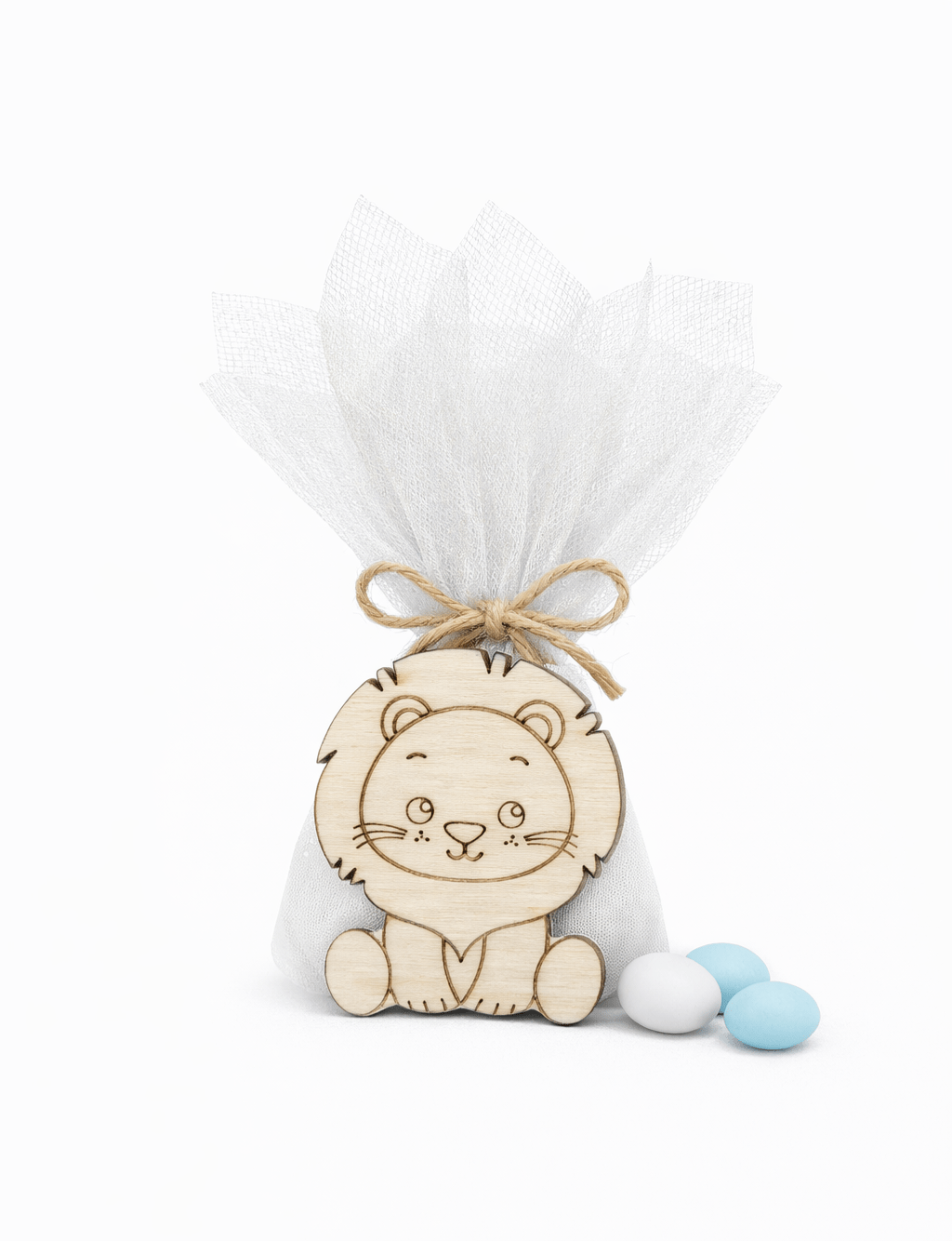 Ένα χαριτωμένο και τρυφερό ξύλινο διακοσμητικό λιονταράκι, ιδανικό για μπομπονιέρες βάπτισης, baby shower ή παιδικές εκδηλώσεις.