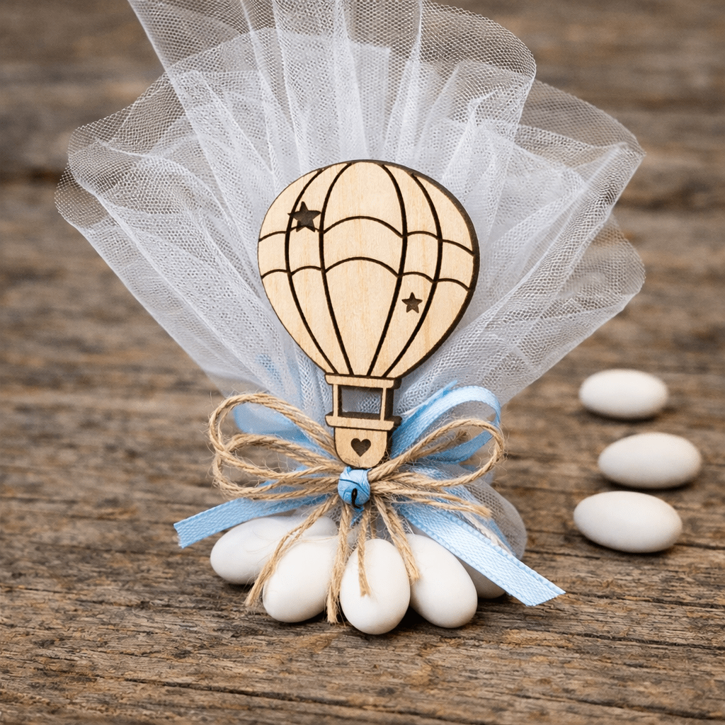 Μια γλυκιά και κομψή μπομπονιέρα, ιδανική για βάπτιση ή baby shower. Διακοσμημένη με λευκό τούλι και ξύλινο διακοσμητικό αερόστατο κομμένο με ακρίβεια CNC, δεμένη με φυσικό σπάγκο και κορδέλα σε απαλό χρώμα. Ένα τρυφερό και διαχρονικό αναμνηστικό που ταιριάζει υπέροχα σε θεματική αερόστατο, ταξίδι ή ουρανός.