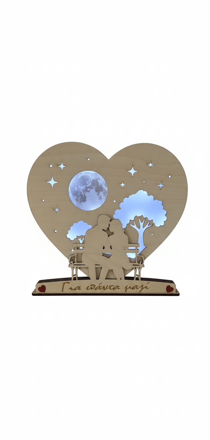 Ξύλινο διακοσμητικό 3D με ρομαντικό σχέδιο ζευγαριού σε παγκάκι, μέσα σε καρδιά με φεγγάρι και αστέρια. Διαθέτει ενσωματωμένο φωτισμό που δημιουργεί ζεστή, ατμοσφαιρική λάμψη και αναδεικνύει το σχέδιο. Ιδανικό για δώρο αγάπης ή διακόσμηση χώρου.