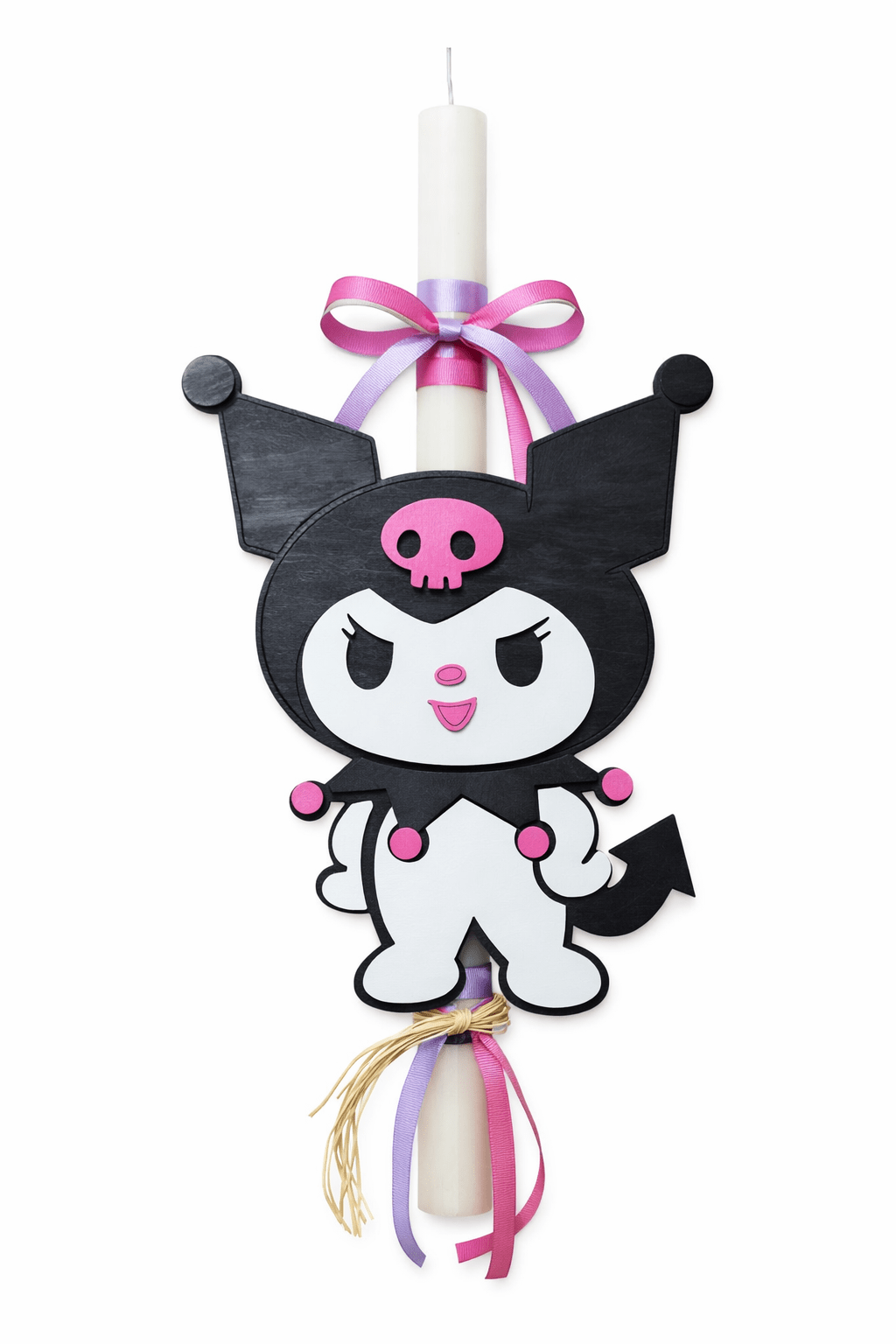 Πασχαλινή λαμπάδα διακοσμημένη με ξύλινη φιγούρα σε μοντέρνο στυλ, σε ασπρόμαυρους τόνους με ροζ λεπτομέρειες. Η σύνθεση ολοκληρώνεται με διπλό φιόγκο σε ροζ και λιλά αποχρώσεις, δημιουργώντας ένα ιδιαίτερο και παιχνιδιάρικο αποτέλεσμα που θα ενθουσιάσει τα παιδιά. Μια ξεχωριστή χειροποίητη πρόταση για το Πάσχα.