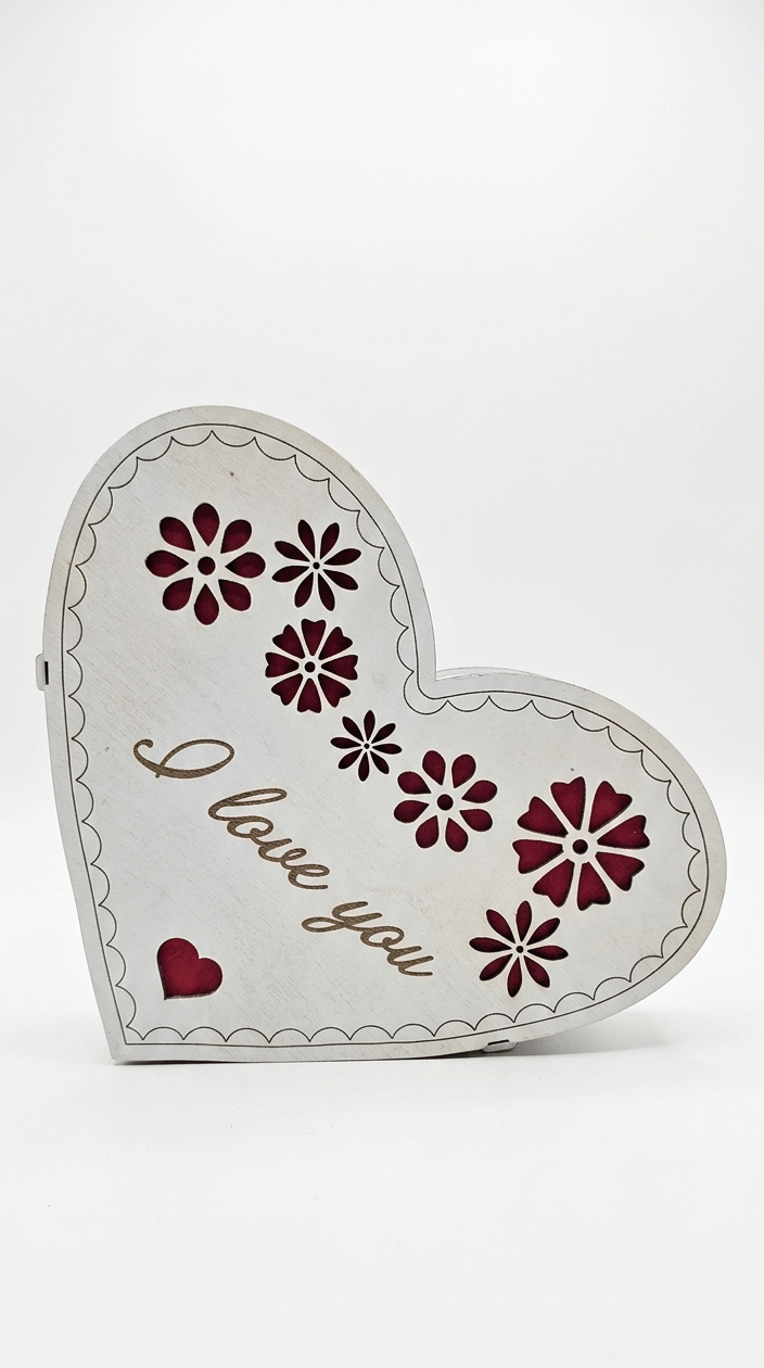 Ξύλινη διακοσμητική καρδιά με κομψό floral σχέδιο και χαραγμένη τη φράση “I love you”. Οι διακριτικές λεπτομέρειες με τα κόκκινα λουλούδια και τη μικρή καρδιά στο κάτω μέρος δημιουργούν ένα ρομαντικό και ζεστό αποτέλεσμα, ιδανικό για να εκφράσεις την αγάπη σου με έναν απλό αλλά ουσιαστικό τρόπο.Ταιριάζει τέλεια ως διακόσμηση σε σπίτι, υπνοδωμάτιο ή ως ιδιαίτερο δώρο για επετείους, γιορτές και ξεχωριστές στιγμές