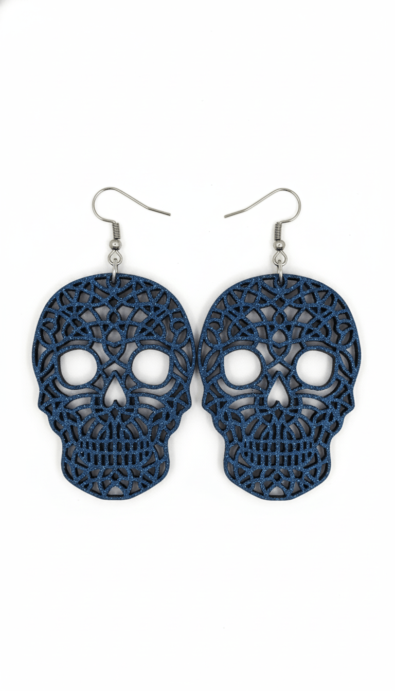 Χειροποίητα σκουλαρίκια νεκροκεφαλή σε βαθύ μπλε glitter που αποπνέουν δυναμισμό και μοναδικό στυλ. Ο λεπτομερής, δαντελωτός σχεδιασμός τους αναδεικνύει το ιδιαίτερο σχήμα και δημιουργεί ένα εντυπωσιακό αποτέλεσμα χωρίς να βαραίνει το αυτί.