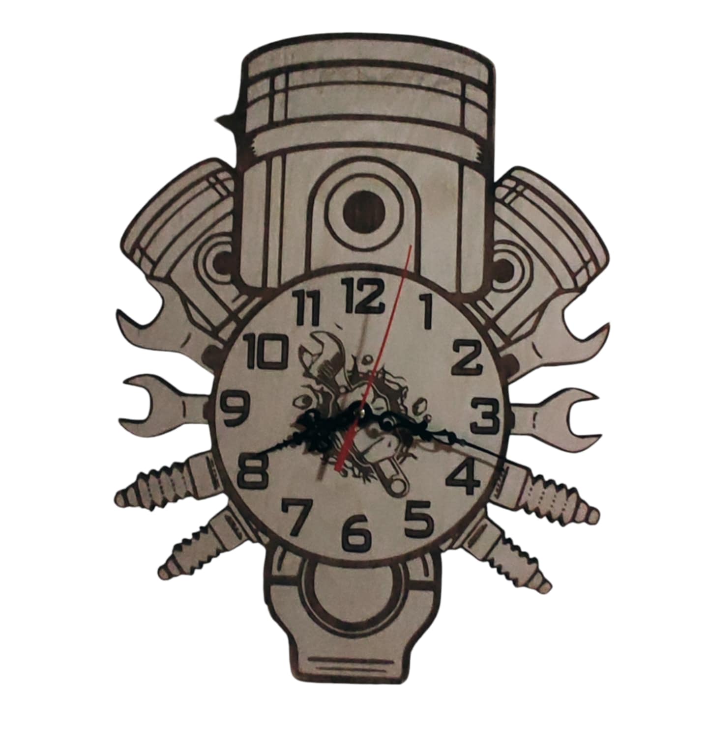 Ξύλινο διακοσμητικό ρολόι τοίχου με πρωτότυπο βιομηχανικό σχέδιο, εμπνευσμένο από μηχανικά εξαρτήματα. Διαθέτει ανάγλυφη κοπή CNC και εντυπωσιακή απεικόνιση εμβόλου, κλειδιών και μπουζί γύρω από το καντράν, προσδίδοντας δυναμικό και μοντέρνο χαρακτήρα. Ιδανικό για εργαστήριο, γκαράζ, ανδρικό χώρο ή ως ιδιαίτερο δώρο.