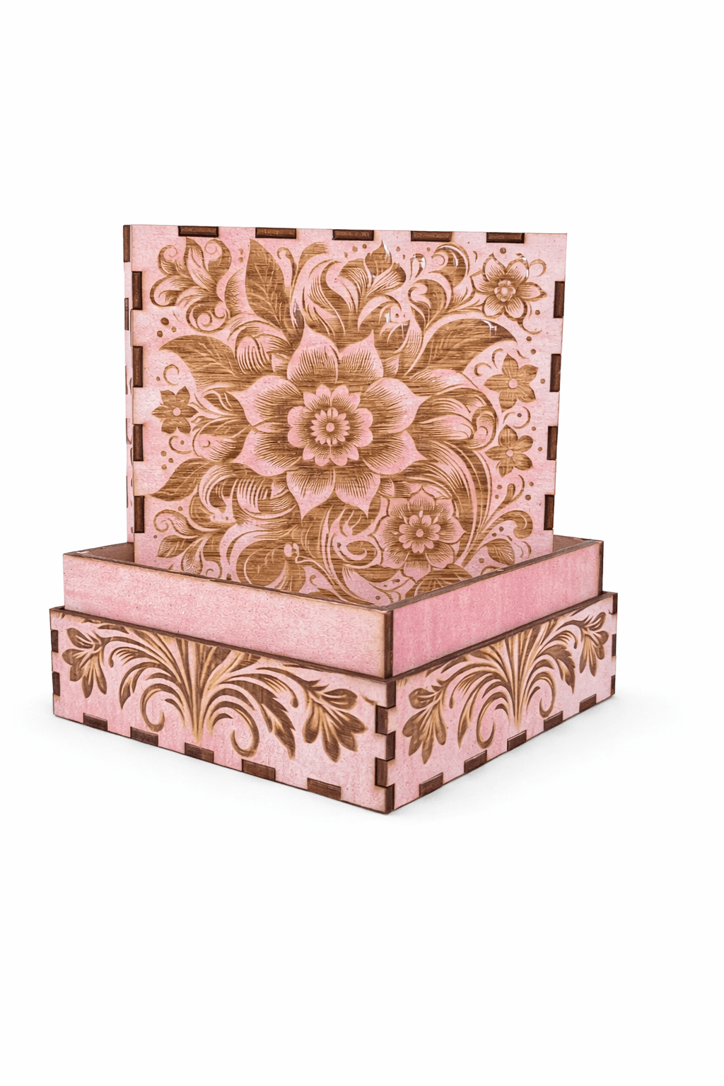 Ξύλινο διακοσμητικό κουτί με χαραγμένο floral σχέδιο στο καπάκι, εμπνευσμένο από μαντάλα και φυσικά μοτίβα. Κατασκευασμένο με προσοχή στη λεπτομέρεια, διαθέτει εμφανείς ενώσεις τύπου finger joint που αναδεικνύουν τη χειροποίητη ποιότητα και τη στιβαρότητά του.