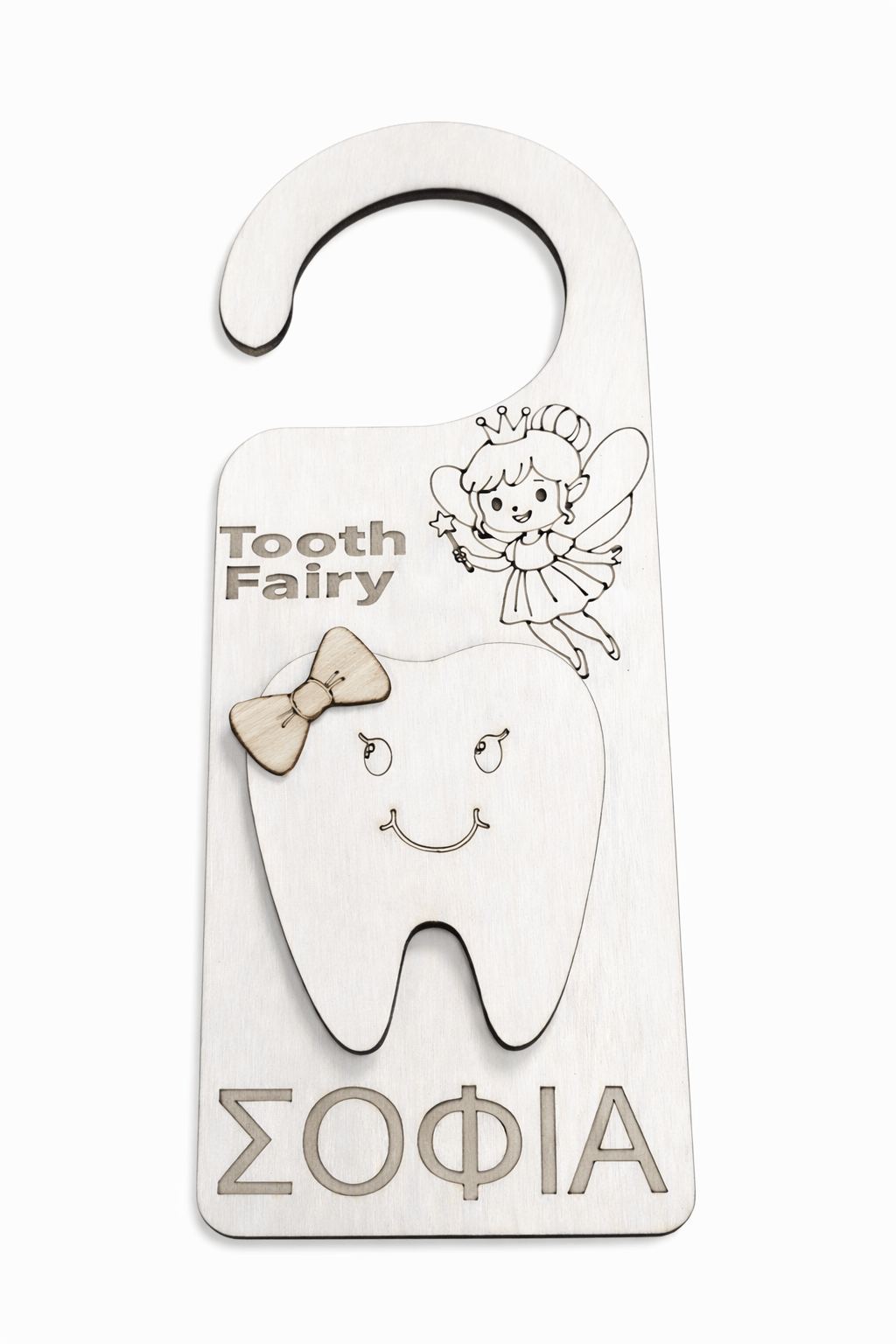 Ξύλινο κρεμαστό πόρτας Tooth Fairy, ιδανικό για τη μαγική στιγμή της πρώτης απώλειας δοντιού. Με χαραγμένη νεράιδα, ανάγλυφο δοντάκι και προσωποποίηση ονόματος, κρεμιέται εύκολα στο πόμολο και γίνεται ένα γλυκό, ξεχωριστό αναμνηστικό για το παιδί ✨Το όνομα αλλάζει κατόπιν συνεννόησης.