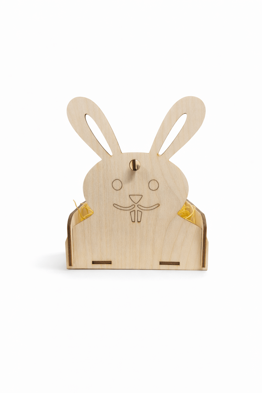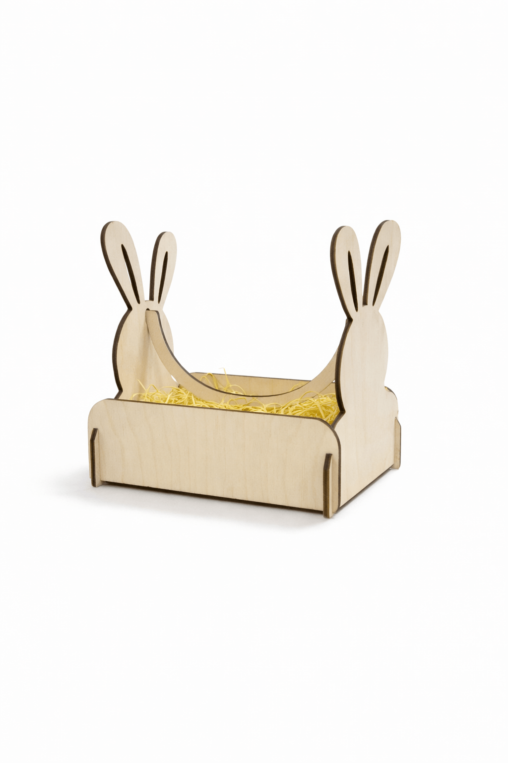 Χειροποίητο ξύλινο πασχαλινό καλαθάκι με χαριτωμένο σχέδιο λαγουδάκι, ιδανικό για πασχαλινές συνθέσεις και δώρα. Κατασκευασμένο από φυσικό ξύλο, με προσεγμένη κοπή και συναρμολόγηση, αποτελεί μια κομψή και οικολογική επιλογή για τη διακόσμηση του Πάσχα.