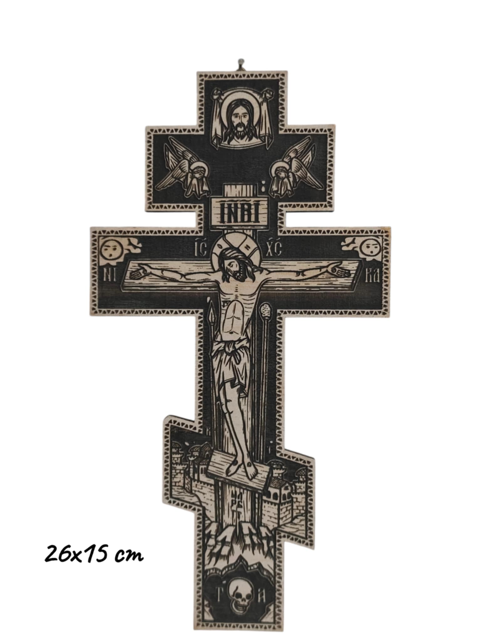 Ξύλινος ορθόδοξος σταυρός με λεπτομερή εικονογραφική χάραξη και παραδοσιακή απεικόνιση της Σταύρωσης. Διαθέτει κοπή CNC υψηλής ακρίβειας και έντονη αντίθεση φυσικού ξύλου με σκούρες λεπτομέρειες, αναδεικνύοντας τα σύμβολα «ΙΝΒΙ», «ΙϹ ΧϹ» και αγιογραφικά στοιχεία. Κατάλληλος για εικονοστάσι, χώρο προσευχής ή ως συμβολικό δώρο πίστης